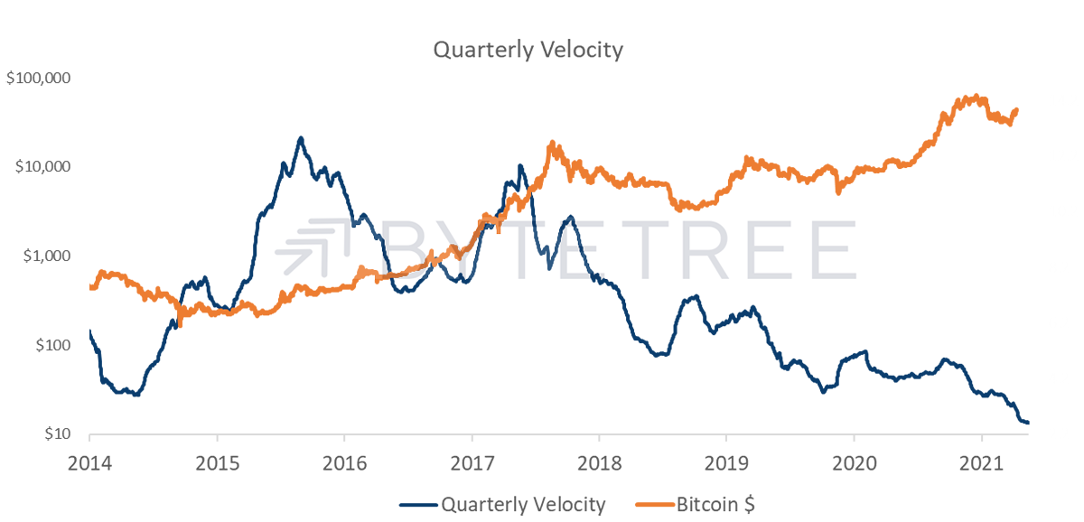 Viewed over an extended time frame, the velocity metric is clearly in a structural downtrend, which suggests an investor base less inclined to trade. However, on closer inspection you can see that it has been rare for bitcoin to sustainably move higher without a 6-18 month period of velocity improvement. It was the case leading up to the April/May peak this year, but worryingly has shown no sign of recovery since. While HODLing is great in theory, there is a risk is that hoarders are simply creating a large overhang should the rationale for owning bitcoin become impaired.