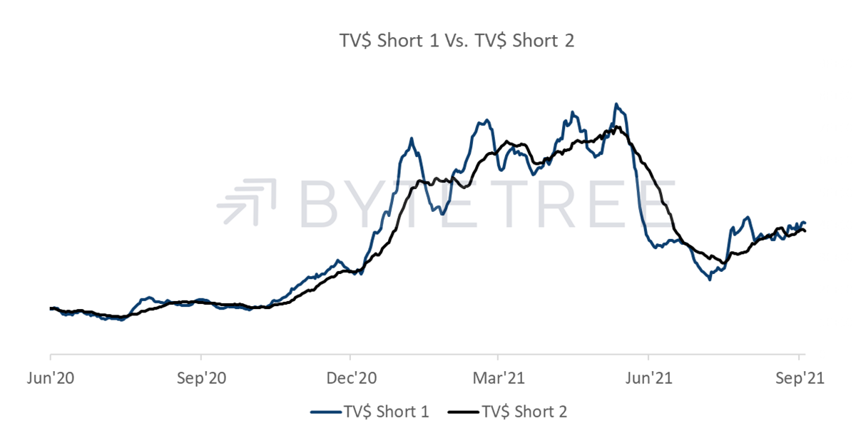 While transaction values have been trending gently higher of late, as shown below, they are only at levels seen in mid-December 2020. Taken together with our valuation methodology, this reinforces the idea that the price has moved some way ahead of network fundamentals.