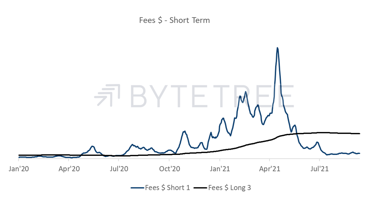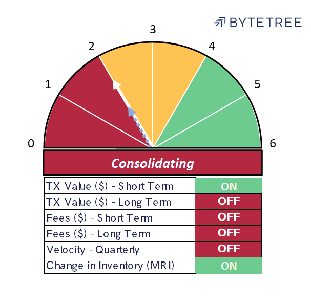 The two signals that remain “ON” are short-term transactions and miner’s rolling inventory (MRI). Fees, which historically have been a strong indicator of a thriving network, remain very soft. What is striking in the long-term fee indicator chart below is that the long-term moving average (black line, calculated over 52 weeks) has actually gone negative over the last month or so.