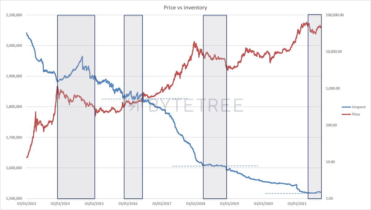 This means that the miners are more reliant than ever on selling their newly minted bitcoin into the secondary market to pay the bills. One might assume that they are enjoying substantial margins at current prices, and therefore the inclination to unload is minimal. This would change, of course, if there were a broader sell-down, necessitating the unwinding of inventory. History tells us that a structural bull market is incompatible with periods when unspent inventory is rising, which is the situation we are now in. This is shown in the chart below, where the shaded areas are periods of rising or stagnating miner inventory.