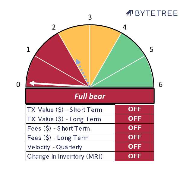 The Network Demand Model has once again turned south, with a reading of 0/6, down from last week’s 2/6. Unexpectedly, both the short-term transaction and the Miner’s Rolling Inventory indicators have softened. Additionally, the long-term transaction indicator, having looked like it would turn positive again, has lurched south. The news that the Chinese authorities are stepping up efforts to clamp down on cryptocurrencies has clearly had some impact on network activity.