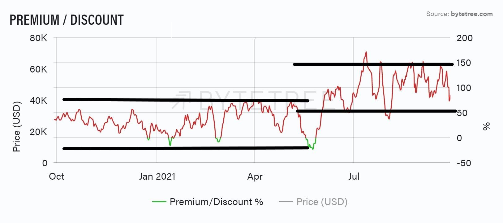 It is of note that the reduction of network activity since the first of this year’s Chinese clampdowns (in May), has coincided with a period in which bitcoin has traded at a significantly higher premium to the ByteTree Fair Value than historically, as shown in the following chart.