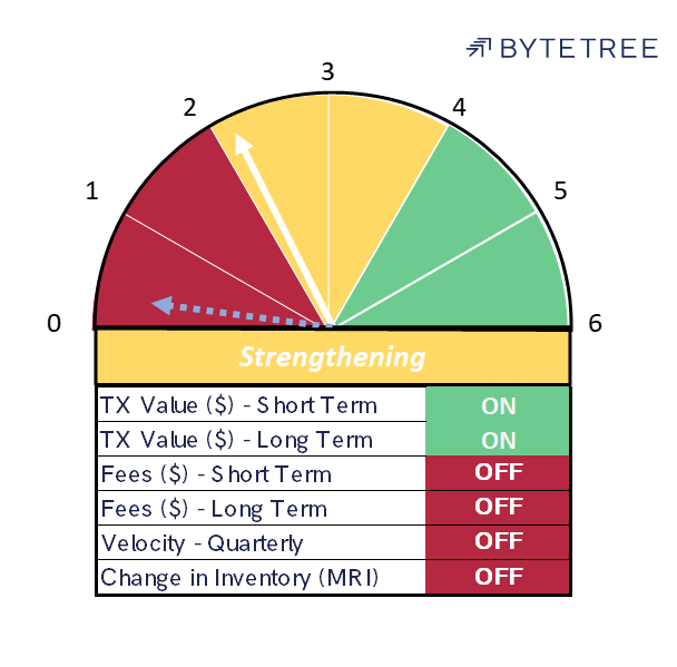 Having come from 0/6 last week, the Network Demand Model finished the period on 2/6, with both the short- and long-term transaction series turning on. During the week, Miner’s Rolling Inventory (MRI) flickered between on and off, so we have been at 3/6 during the week.