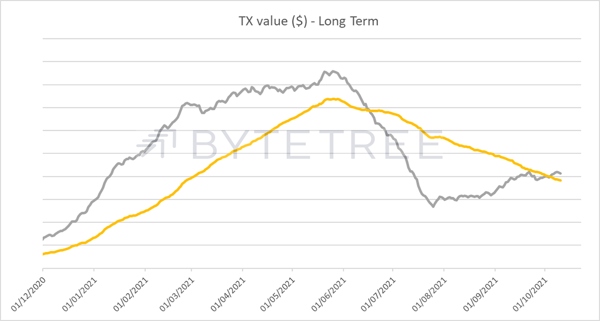 It is particularly notable that the long-term transaction indicator has turned back on for the first time since the 17th June, when the price closed just below US$38,000. Unlike the other metrics, the transaction (TX) series are in part driven by the bitcoin price, so they are inherently reflexive.