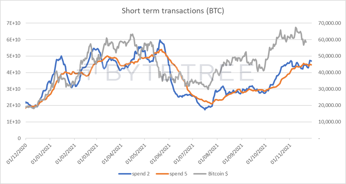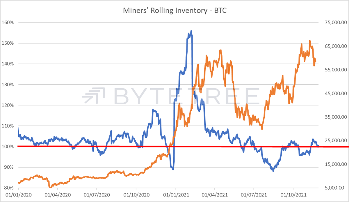 The miners continue to emit a mood of quiet confidence. They have been selling a bit more aggressively of late, which might coincide with renewed clampdowns in China and a regulatory clampdown in India. This appears to have mainly passed, as can be seen below, where the blue line has gravitated back towards the equilibrium level of around 100%.