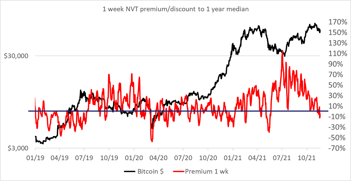 One chart that provides a high level of comfort, and one we haven’t shown for a while, looks at the 1-week rolling NVT (effectively bitcoin’s price to sales ratio) against the 1-year historic median. This shows us where bitcoin is trading against its own (recent) history. We postulated a couple of months ago that bitcoin could be justified in re-rating on account of
