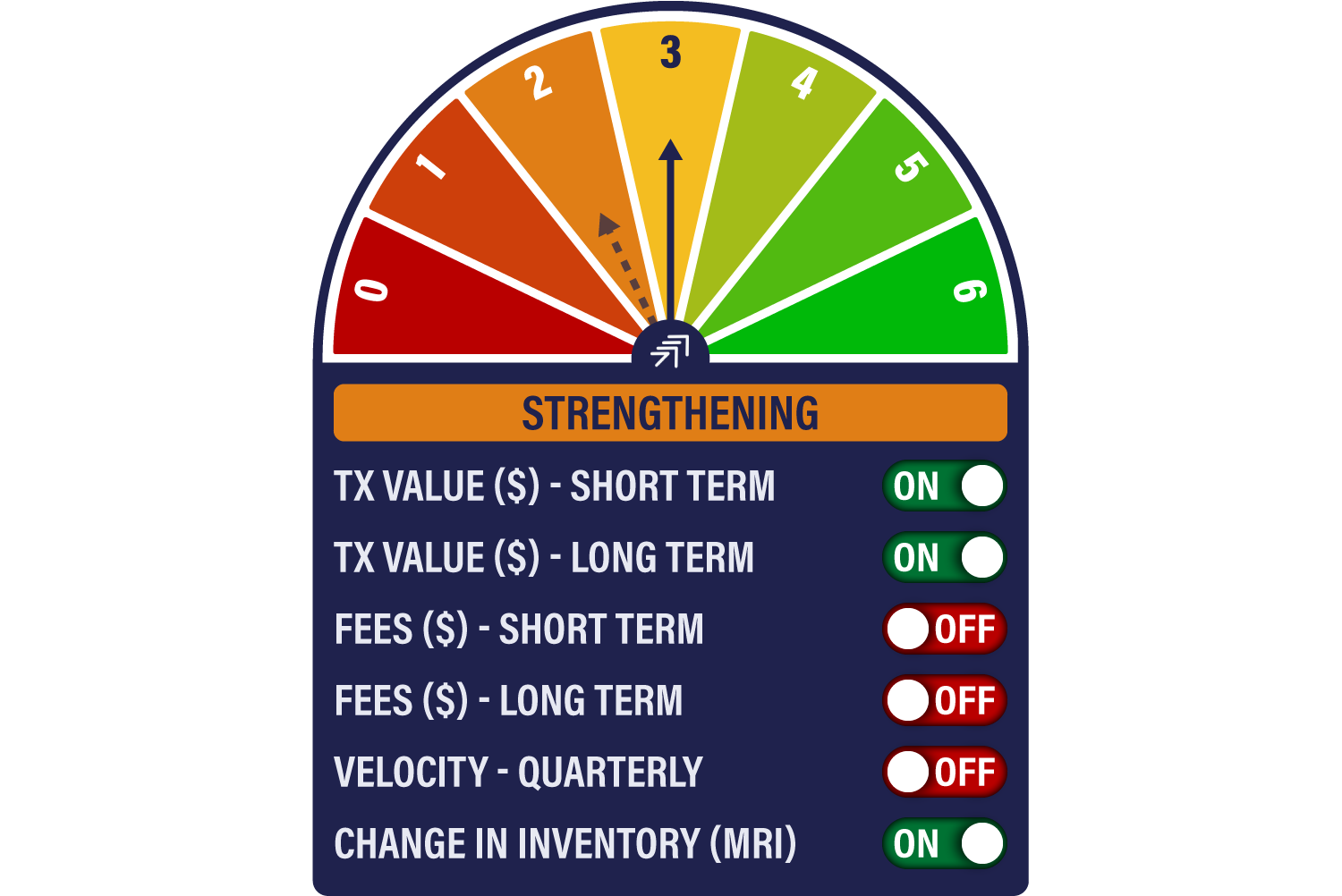 The Bitcoin Network Demand model has perked up again this week, with stronger transaction data taking the score to 3/6 from 2/6. The short-term spend signal has turned back on, as did the Miner’s Rolling Inventory, the latter after a brief intra-week dip.