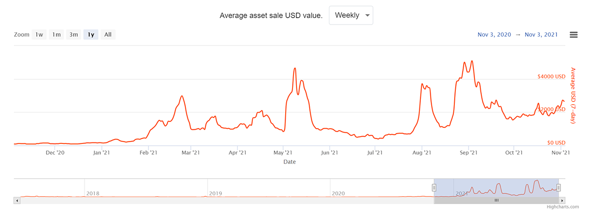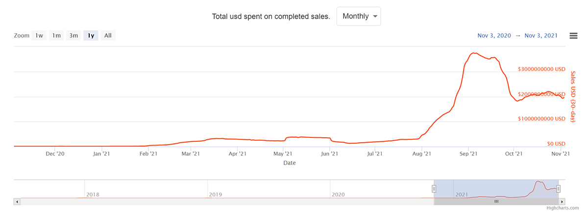 The non-fungible space has exceeded many people’s adoption expectations. In November 2020, only 6,000 unique wallets were buying or selling a non-fungible asset weekly. As of October 2021, this hit a peak of 100,000 unique wallets weekly. That’s a growth of nearly 1,700% in one year.