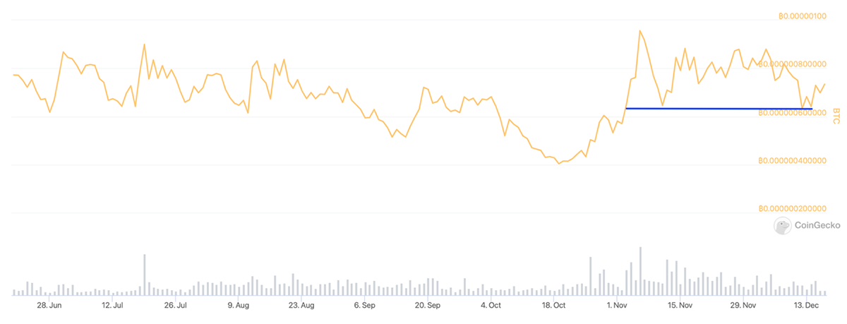 Looking at CUDOS relative to BTC, there’s nothing significant to note, except for it making a one-month relative low earlier this week. This is similar to the $USD price chart above, where the gains made in November have been retraced.