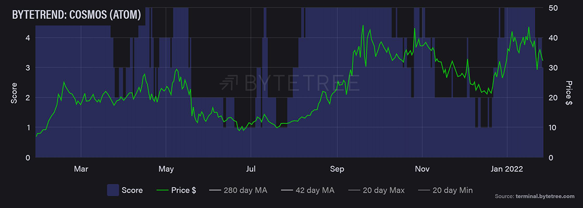 In recent months, Cosmos ATOM has been one of the top performers, consistently scoring 5 stars on ByteTrend for multiple consecutive weeks, along with Cosmos ecosystem blockchain, Terra (LUNA). However, both are seeing a correction at present; after all, no assets are safe from the marketwide corrections. But, despite most Cryptocurrencies sitting 50%-70% below all-time highs, Cosmos ATOM is just 22.12% from its highs.