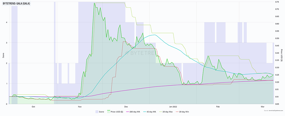 In the ByteTrend chart below, we can see that GALA hit its all-time high of $0.74 in November 2021, no doubt fuelled by Facebook’s “Meta” announcement. The bullish run continued to mid-December, where it cooled, keeping at a level pace ever since.