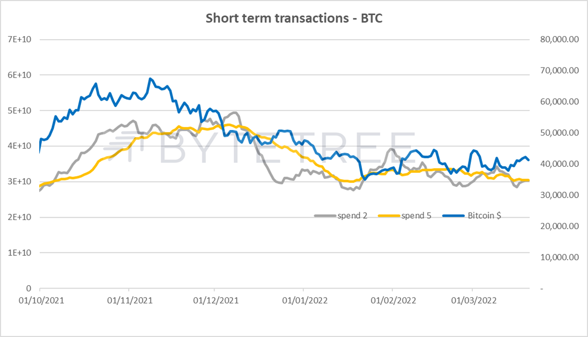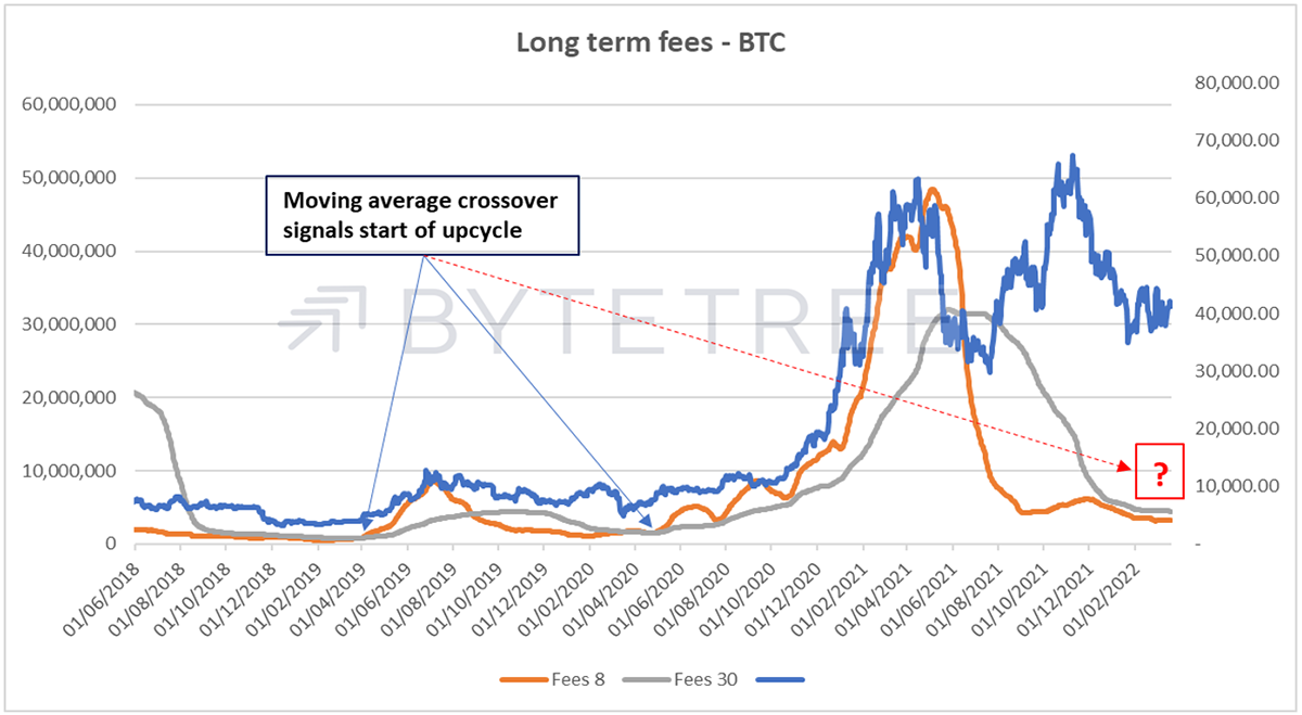 Fees have also started to bottom out, a sign that things are unlikely to deteriorate further. This has been a powerful indicator in the past, with previous crossovers signalling a bull market resumption. As with transactions, we’re not there yet, but investors should keep a careful eye on this metric and prepare for an upturn.
