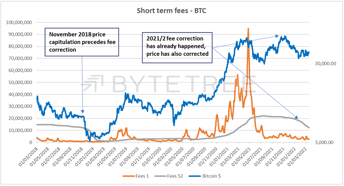 However, as the long-term fee structure rebases this worries me less. As seen on the chart below, we have also seen a major price correction, the difference this time being that it has corrected from a secondary peak, which didn’t happen in 2018. In other words, it could be that the capitulation I’ve been worried about has already happened, just this time from a much higher base.