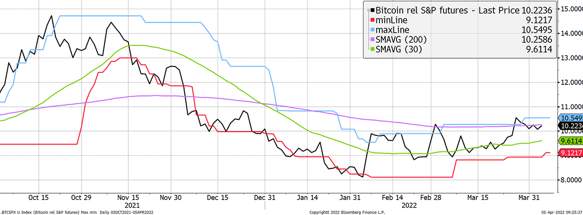 Bitcoin relative to the S&P 500 holds 5/5