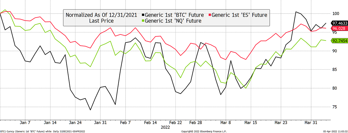 Just to remind you what bitcoin (BTC future) looks like against the S&P 500 (ES future) and the NASDAQ (NQ future) this year. They have more in common than ever before.