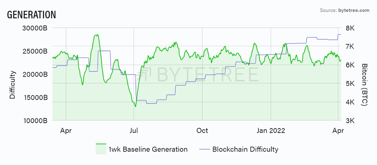 Source: ByteTree. Bitcoin Generation and Blockchain Difficulty over the past year.