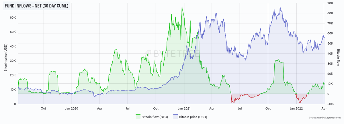 Source: ByteTree. Bitcoin net fund inflows (30-day cumulative) and price, since July 2019.