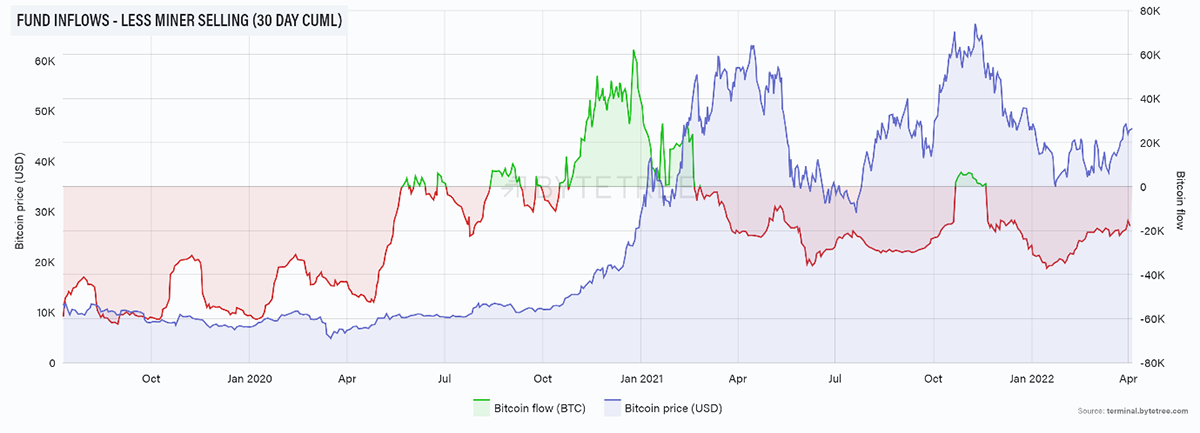 Source: ByteTree. Bitcoin net fund inflows (30-day cumulative), less miner selling, and price, since July 2019.