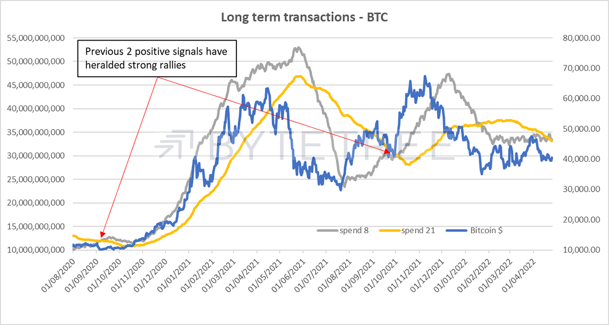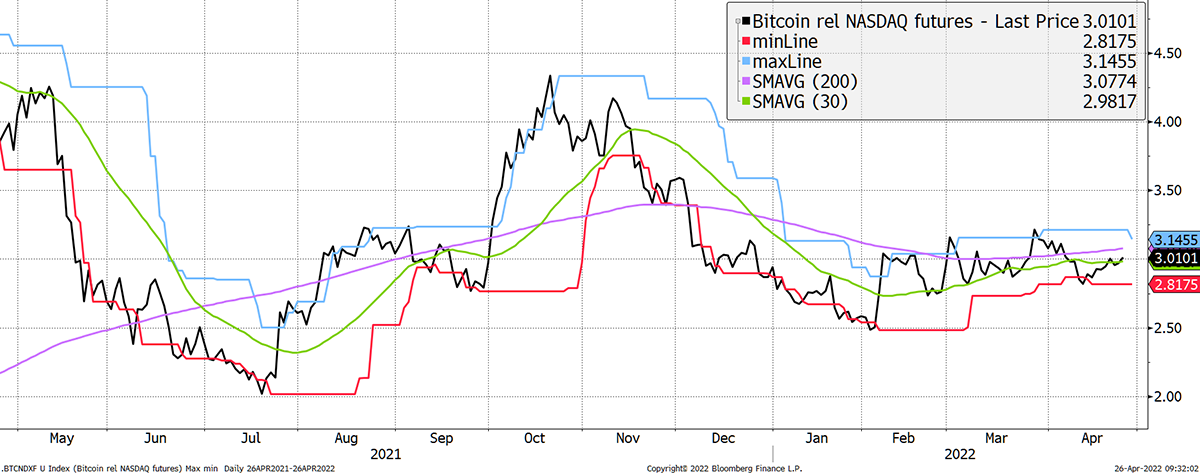 I want to see 5/5, and so 2/5 isn’t much to write home about, but it wouldn’t take much, given the tight range. Even if it doesn’t, the BTC NASDAQ relationship is stronger than ever before, as past bear markets would have seen it much lower.