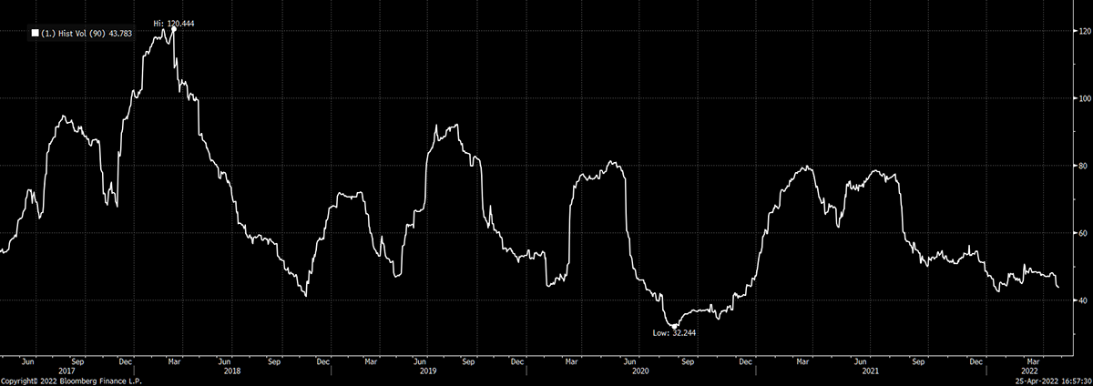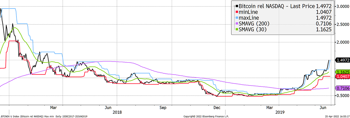 It isn’t just the price relative relationship that matters, but the volatility between these assets. In 2018, that peaked at 120% and is now closer to 40%. However you look at it, bitcoin has grown up a great deal and continues to do so. Vol hasn’t only fallen in USD, but in NASDAQ too. This helps investors see it as an acceptable alternative.