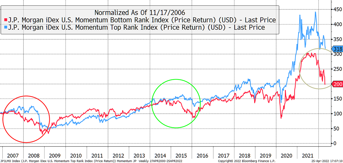 The chart shows the momentum stocks (past best performers) in blue, and the laggards (past worst performers) in red. When the losers are making new lows, that’s bad, as highlighted.