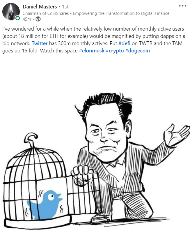 But behind that, the deal for Musk to buy Twitter was agreed, and whatever it means for free speech, it’ll be good for crypto. I can’t put it better than Danny Masters, Chairman of CoinShares, and a ByteTree board member.