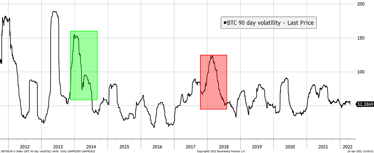 The other comfort comes from bitcoin’s price volatility. Notice how volatility surged in the 2014 and 2018 bear markets. While still high, 52% is looking increasingly respectable.