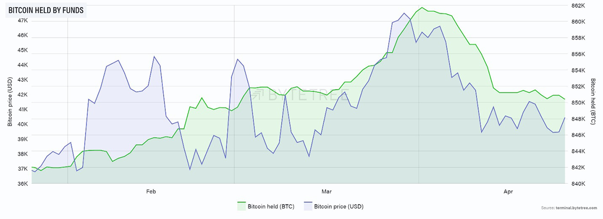 Source: ByteTree. Bitcoin held by funds and price in USD over the past three months.