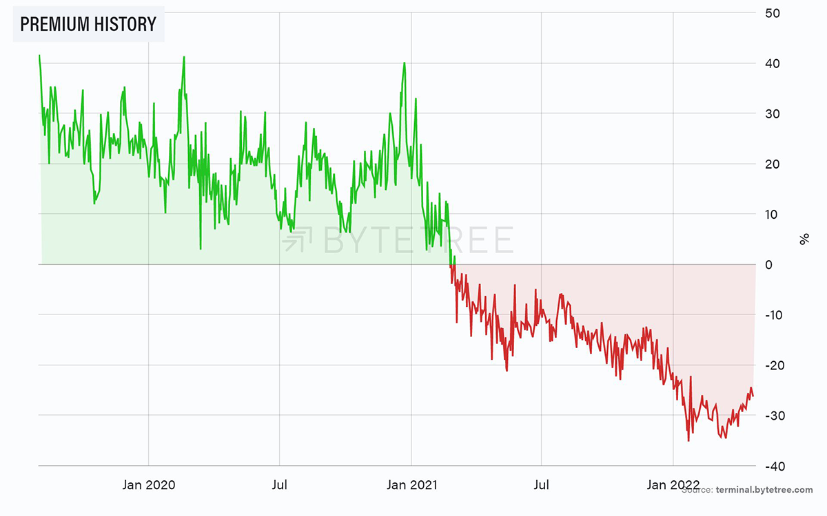 Source: ByteTree. Premium/discount of the Grayscale Bitcoin Trust (GBTC).