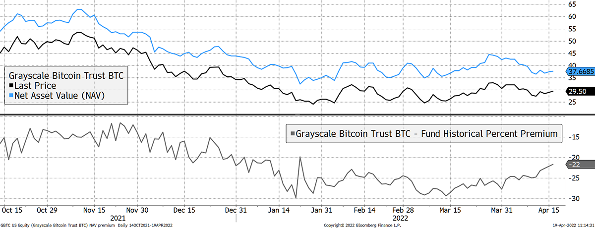 I showed GBTC last week with the discount narrowing to 25%. Well, it’s now 22%, which is notable. For whatever reason, GBTC has found a bid.