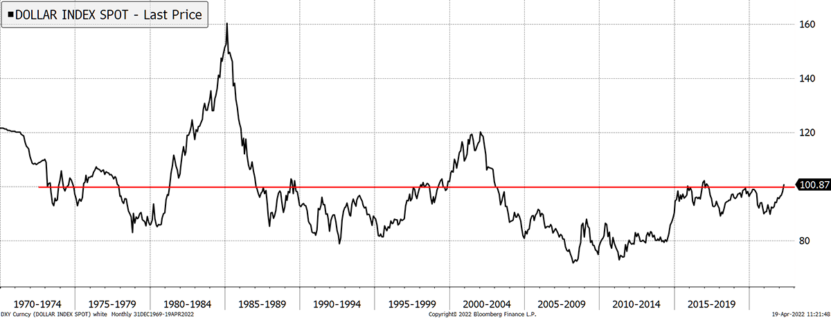 The dollar keeps on strengthening. I show it here since 1970 with the 100 level in red. These strong dollar periods have always been painful for financial markets, so we all look forward to this rally coming to an end.