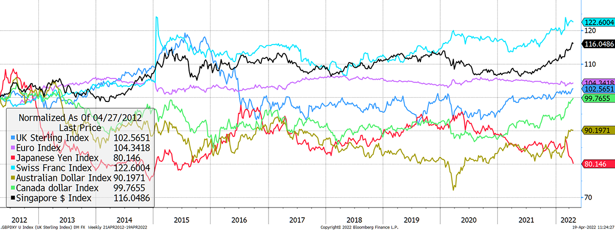 What makes the dollar so strong? US rates are expected to rise quickly compared to others, but some currencies give way faster than others. I show the major currencies against the DXY over the past decade. The Swiss Franc and Singapore Dollars have been the strongest, with the Yen and Aussie the weakest.