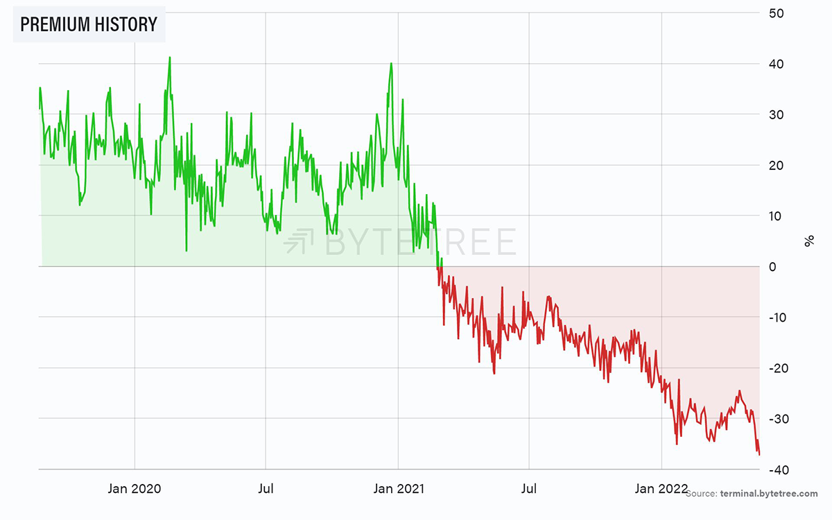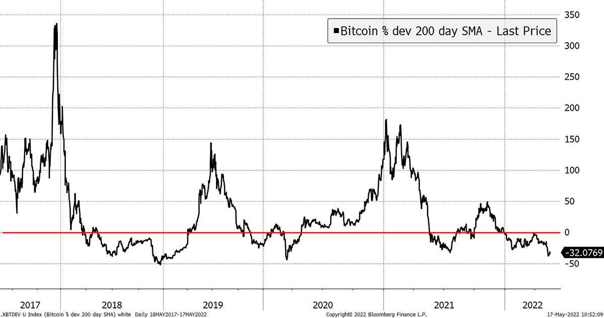 Last week I showed how oversold bitcoin was against the 30-day moving average. This week, we look at the 200-day comparison. Last Wednesday, it touched -38%, which is severely oversold. Back in March 2020, there was a severe macro shock, and in late 2018, there was a “bitcoin-is-bust” moment. Of course, it wasn’t and promptly recovered. In my opinion, this is as bad as it gets.
