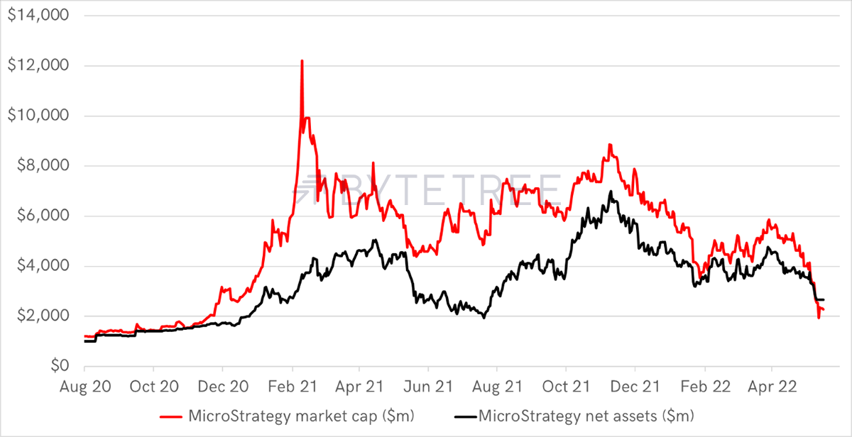 Fund flows are providing decent fodder for contrarians and value investors. Discounts to NAV for the closed-end funds are as high as they’ve ever been (this is frequently used as a contrarian indicator). Yet, there is no sign of panic from the ETFs, which have gently grown as the bitcoin price has tumbled from US$40k to US$30k, shown below.
