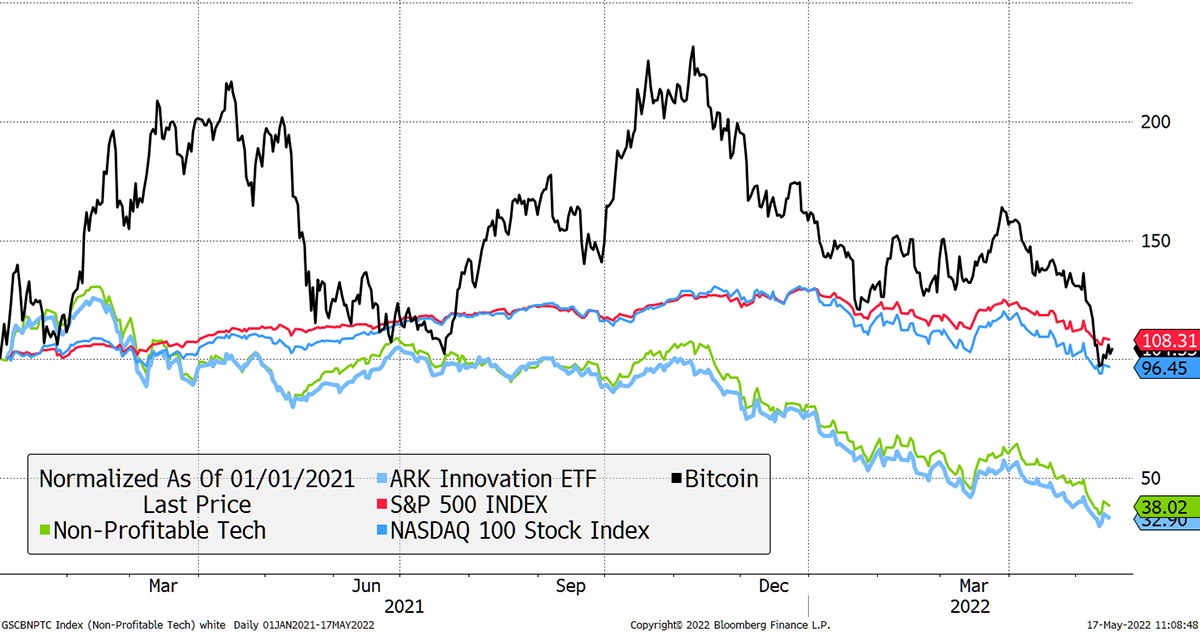 The problem in financial markets is the trainwreck in speculative stocks. It was inevitable, but for the bitcoin bulls, there is a significant disconnect. Since early 2021, bitcoin has been volatile, but the result is closer to the S&P 500 or NASDAQ than it is to the non-profitable tech stocks (NPTS).