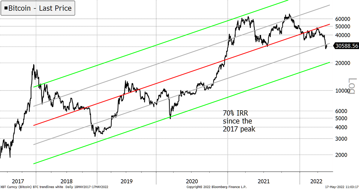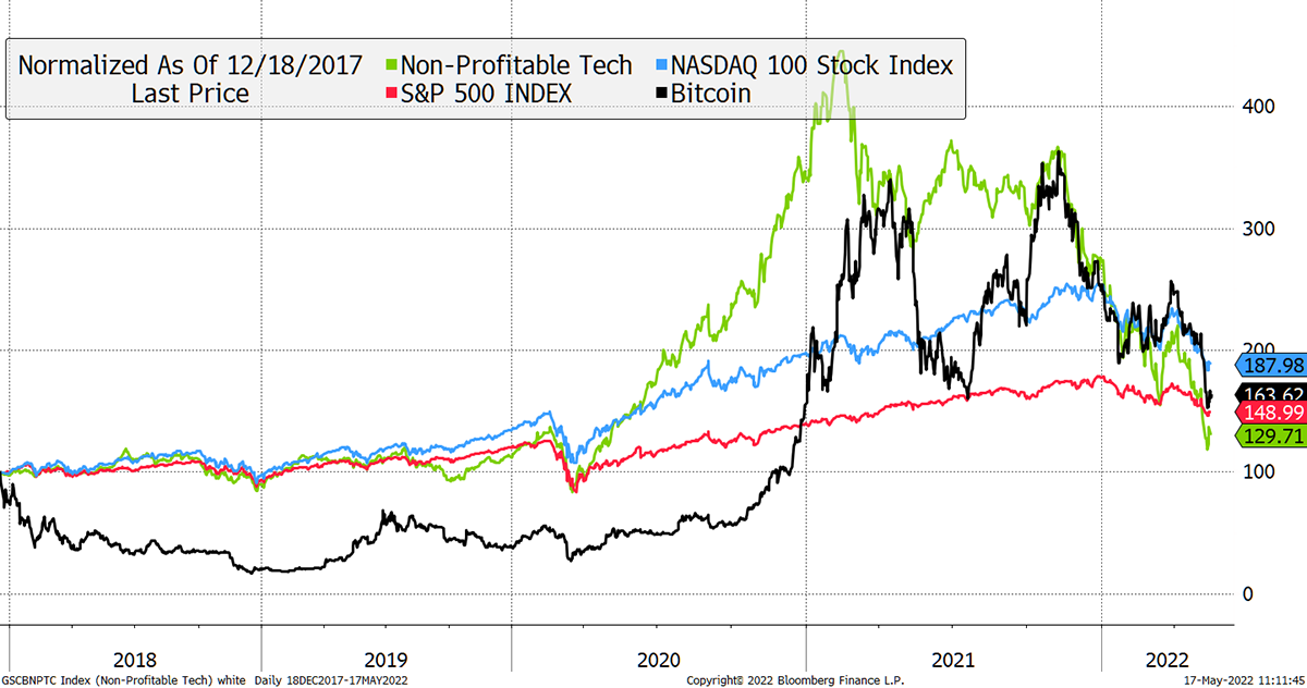 NPTS are deeply oversold and not far from their March 2020 low. I’m not saying they are a buy and may fall further, but the worst of this chapter is behind us. Looking back at the December 2017 bitcoin high, it is remarkable how asset prices have converged. Furthermore, it is clear how over the past six months, they have all fallen together.