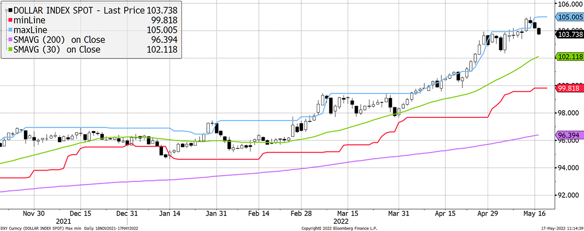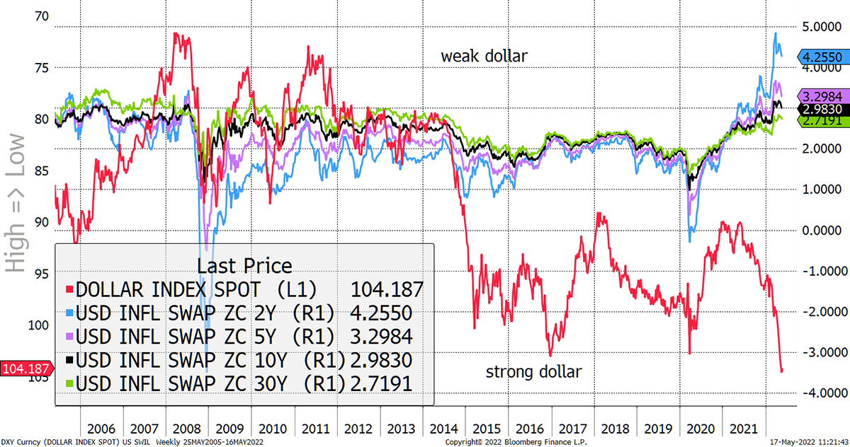 I will next overlay the dollar (inverted axis) with inflation expectations. Normally a strong dollar (red line down) eases inflation, and vice versa. Not this time. Inflation expectations have stabilised, but in times past, would have collapsed on this extreme strength in the dollar.