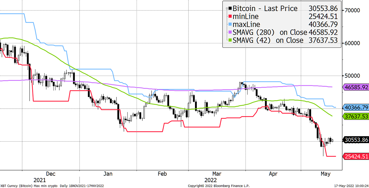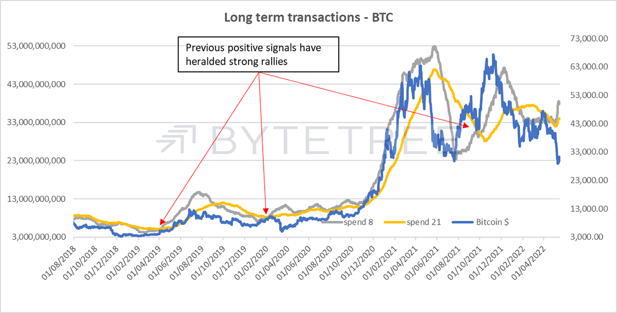 This time the signal turned back on at US$41,000, so the price has already fallen 30% from there. But note that a similar thing occurred in early 2020 when the price tanked with the onset of Covid. This time we’ve had the shock of the UST stablecoin collapse. It would have been painful in the short term if one had bought the signal in 2020, but it worked out spectacularly well for those who held on.