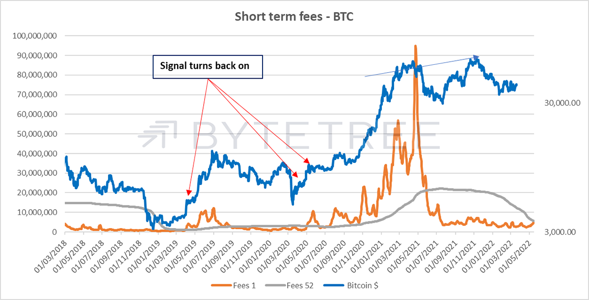 After a very long wait, it looks like the fee indicators will soon start to turn positive. The short-term fee indicator is another that doesn’t move often, but it has generally only turned on at the bottom of cycles, as shown below. Mind you, it hasn’t happened yet, and if activity slumps again, it might not, but worth being aware of because this is a sharp move in the right direction.