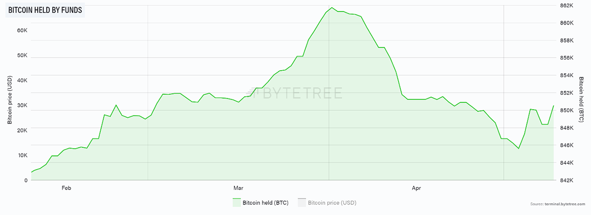 Source: ByteTree. Bitcoin (BTC) held by funds over the past 3 months.