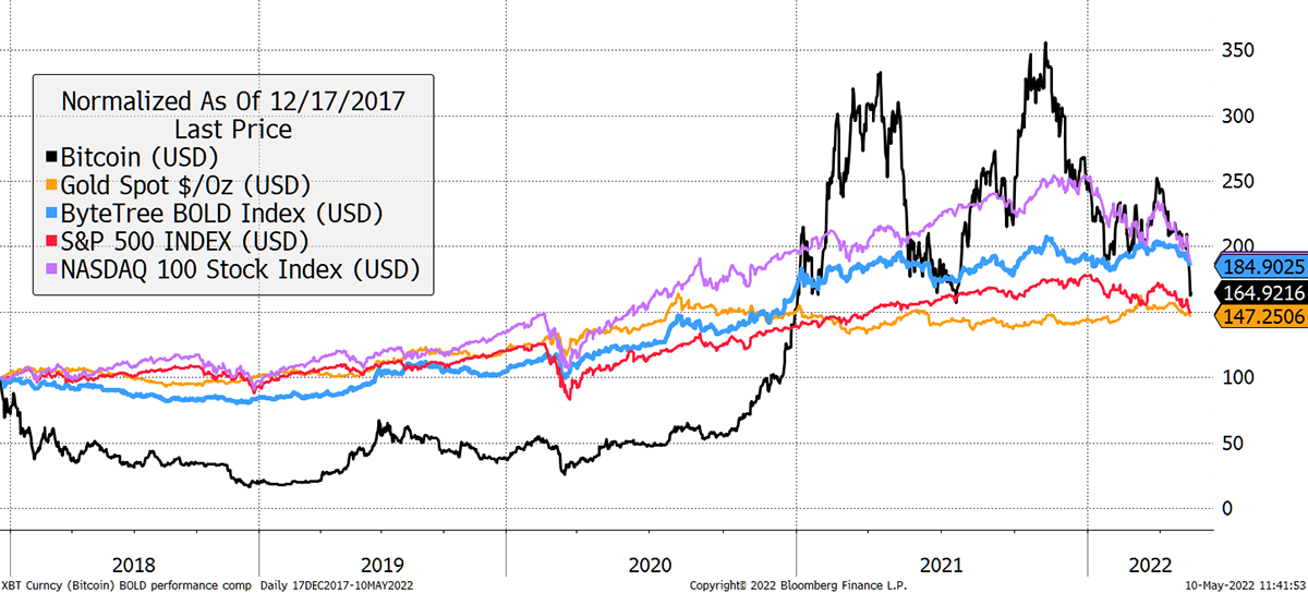 I find it remarkable that since the December 2017 bitcoin peak, bitcoin, gold, the S&P500, and the NASDAQ have all got to roughly the same place in capital terms. The ByteTree BOLD Index just got there with style.