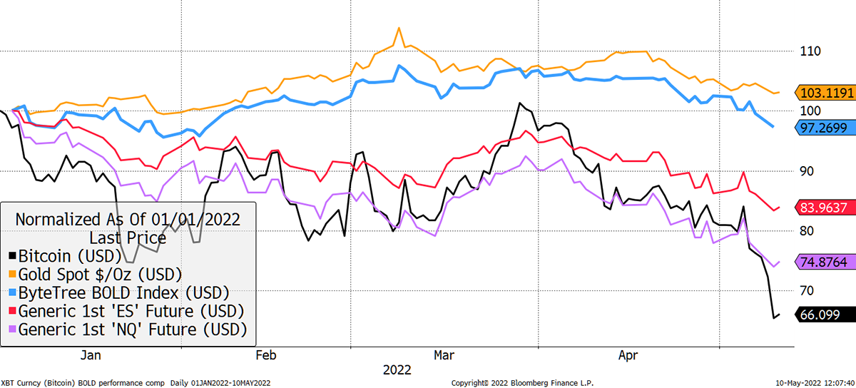 Looking at 2022, bitcoin held the NASDAQ until the TERRA capitulation of recent days. As a result, BitDAQ has slipped as BTC has lagged the NASDAQ.