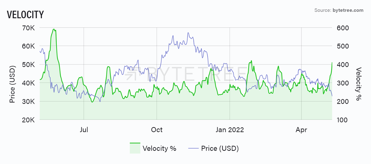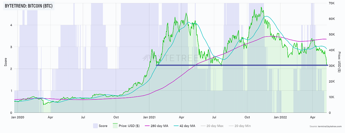 The Network Demand Model is telling us to buy. It rose to 4/6 on Sunday when the price was $38,844. Then came the UST/Terra blow up, which Charlie Erith covers in Cryptonomy below. I’ll focus on the chain.