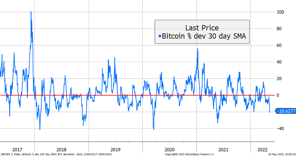 Bitcoin itself is an innocent party in all this. Earlier in the year, it was boosted by the news that the Terra Foundation would be looking to buy up to US$10 billion. Now, it is suffering as this story unravels. It doesn’t change its properties or its long-term prospects. As discussed elsewhere, our on-chain data suggests a high degree of capitulation at prices lower than our fair value. Once again, bitcoin moves from weak to strong hands. We dust ourselves down and head back into the laboratory.