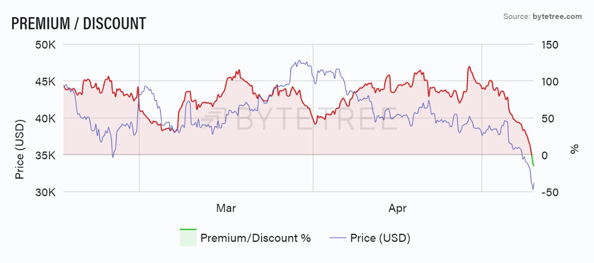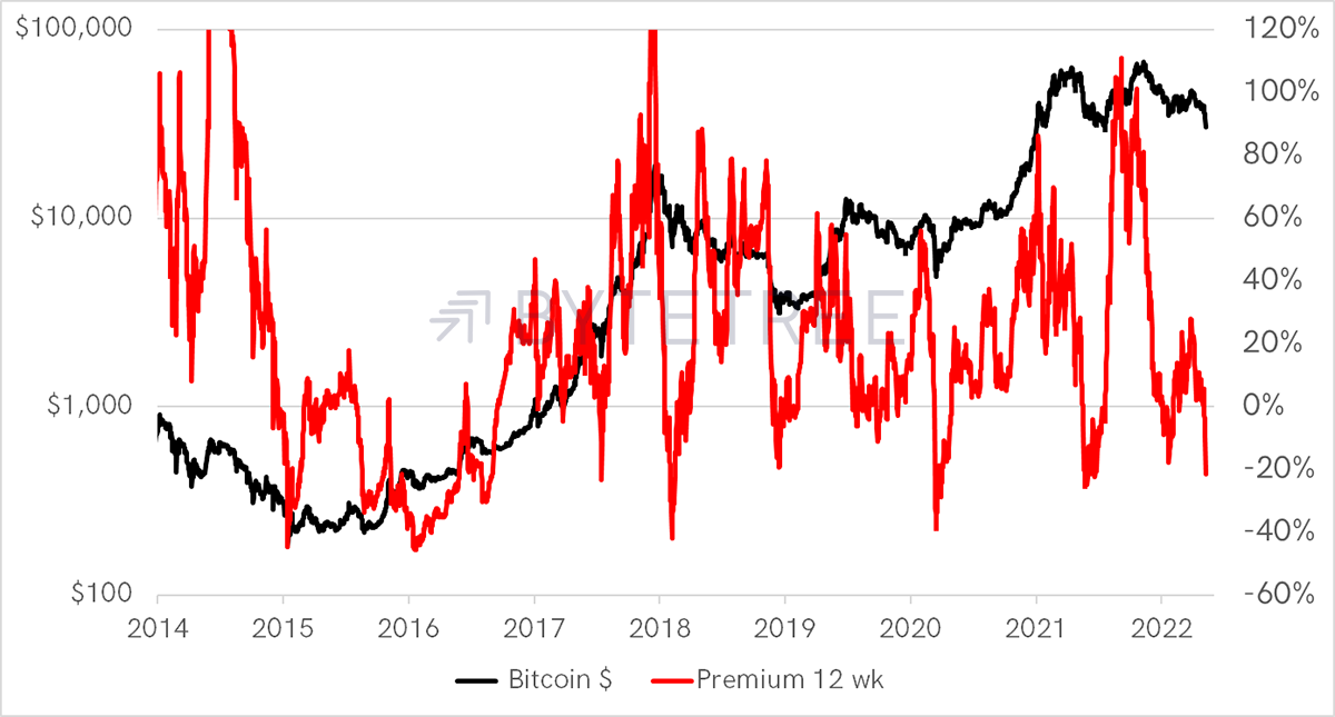 Source: ByteTree. Bitcoin premium/discount (%) and price over the past 3 months.