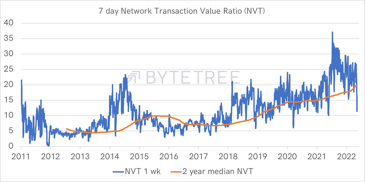 I’ll start with valuation. One-week fair value, which is based on the historical average NVT of 7.7x, suggests you buy this dip. As things have evolved, this model appears to be overly conservative, but even this suggests bitcoin is undervalued.