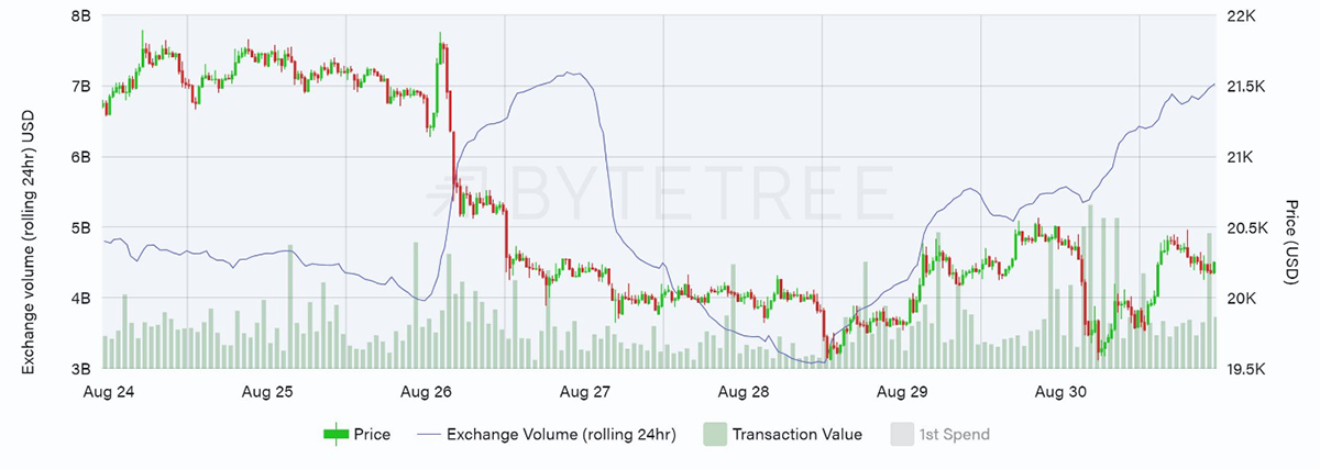 Source: ByteTree. Bitcoin exchange volume, transaction value and price in USD, over the past week.
