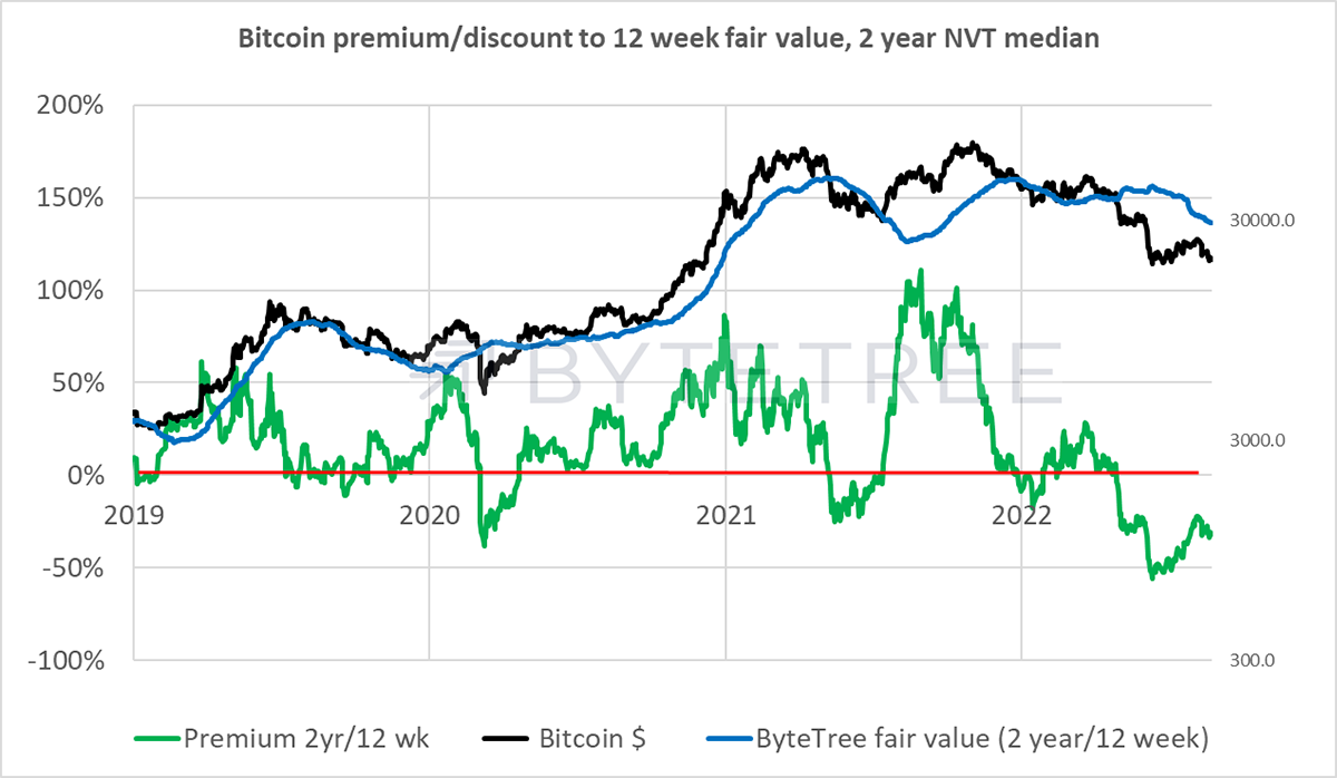 Over the past year, bitcoin has fallen sharply to a level where ByteTree believes it is underpinned. That is based on the underlying network, which has contracted much less than in past bear markets.