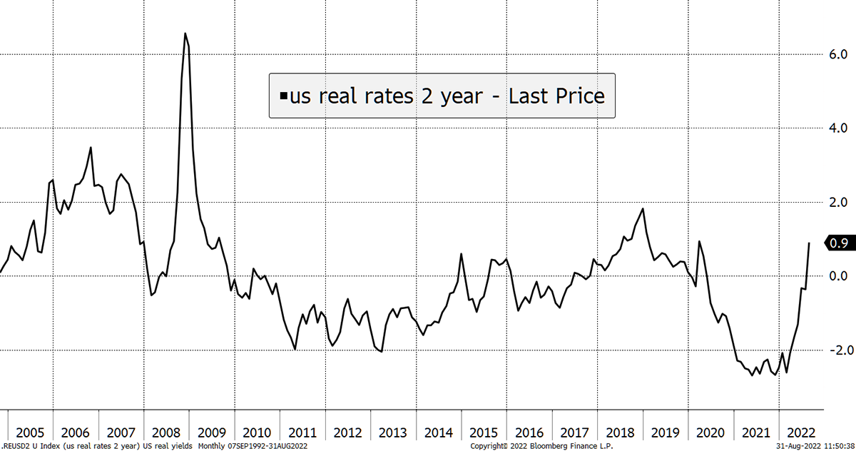 The 2008 crash saw a surge in US real rates (2-year bond yield less 2-year inflation expectations) as inflation went negative. Bitcoin wasn’t around then, but it would come along soon after.