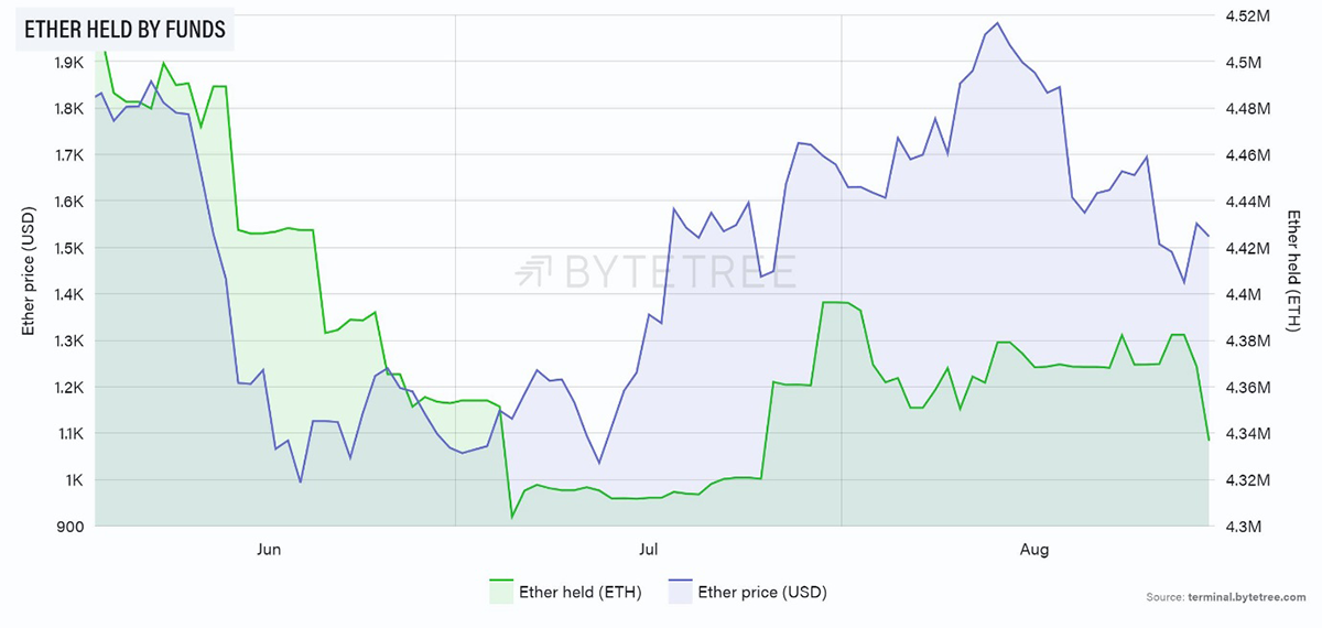 Source: ByteTree. ETH held by funds and price of ETH (USD) over the past 12 weeks.